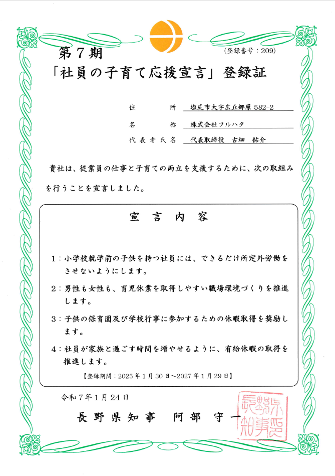 (株)フルハタは、長野県SDGsの目標である「確かな暮らしが営まれる美しい信州」の実現を目指すことに賛同し、長野県SDGs推進企業に登録いたしました。